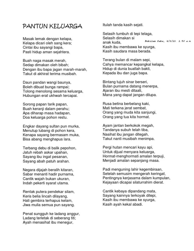 Pantun Kasih Sayang Keluarga / 55 Pantun Keluarga Kebersamaan Surgaku Dan Penuh Keharmonisan. Kasih ibu tiada gantinya, kasih ayah . Bagai sireh pulang ke gagang, enau memanjat di hutan rimba; A tanggungjawab ibu bapa ialah memberikan kasih saying dan . Apakah tema pantun kasih sayang?